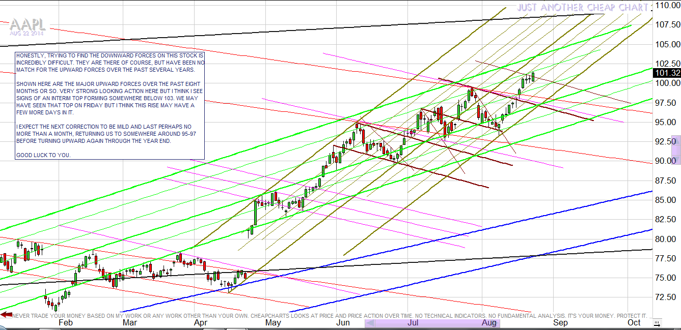 AAPL – HARD TO FIND DOWNWARD FORCES – 82214 Posted August 24, 2014 by Jon in category "AAPL Post navigation EVRY – WORK THE WEDGE OR SKIP THE DIP – 82214 BAC – WORK THE WEDGE AGAINST THE EYE – 82214